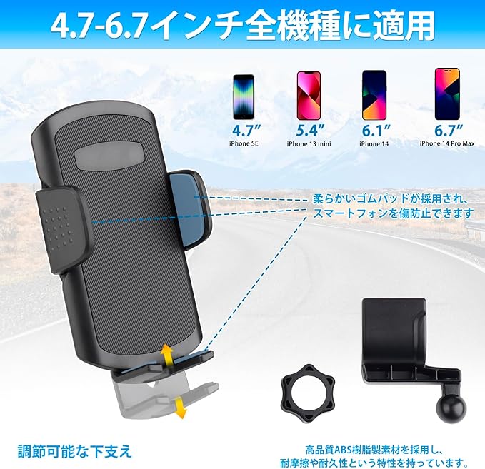 2.【360度回転!幅広い機種対応】:スマホホルダーは360度角度回転可能なため、お好みに合わせて横置きなど角度を調整可能です。それに、本製品は4.7~6.5インチのスマホに適用しています。【購入前にご確認】:一部の機種ではサイドボタンに干渉する可能性がございます。また、手帳型ケースや特殊形状のケースを使用している場合、カバーの厚みにより設置できないことがあります。ご購入の前に、必ず掲載写真のサイズをご確認いただき、スマートフォンのサイドボタン位置やケースの厚みが干渉しないかご確認ください。