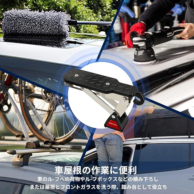 【便利】車両の屋根に簡単に到達でき、車のルーフへの荷物やルーフボックスなどの積み下ろし、あるいは車の屋根やフロントガラスを洗う際、踏み台として役立ちます。