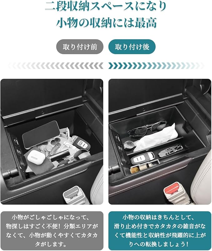 【HUAHAOコンソールトレイ ・ティッシュ置き】センターコンソールのスペースを活用し、広い二段収納スペースを提供します。スマホ、カード、コイン、メガネや鍵など、小物の収納に最適です。トレイの中央にはティッシュを取り出すための切り欠きがあり、ティッシュ置き場の悩みを解消します。それに、滑り止めのラバーマット付きで運転中のガタガタを防ぎます。汚れが付いたら水洗いも可能です。