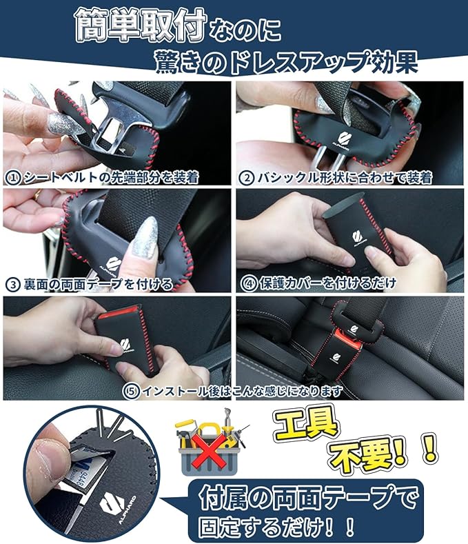 【工具不要、誰でも簡単に取り付け可能】シートベルトバックルを取り外す必要はなく、切り込み構造でそのまま被せるだけで簡単に装着できます。車に詳しくない方でも手軽に取り付け可能です。製品内部には両面テープが付いており、剥がして貼るだけでしっかり固定できます。適用車種:アルファード 20系 30系 40系