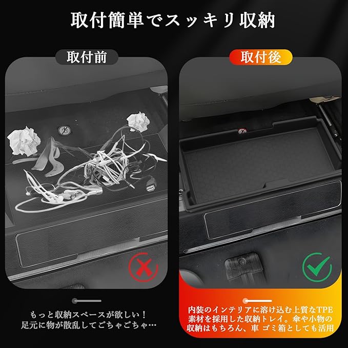 【小物の収納が楽々】助手席のシート下に置くだけで、傘や充電器、鍵、スマホなどの小物を収納できる便利なアイテムです。後部座席の方も小物をトレーに置くことで、座席の隙間に落ちるのを防止できます。また、雨天の日には折りたたみ傘を置けて、車内のマットを汚す心配がありません。