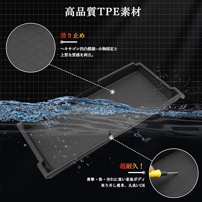 【高品質超耐久TPE素材】アルファード40系 収納トレイ本体は耐熱性・耐衝撃性に優れた高品質のABS樹脂製で、無毒無臭、経年劣化に強い耐久設計です。汚れが付いたら取り外して簡単に水洗い可能。