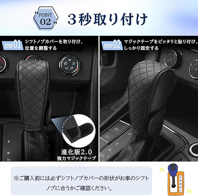 【3秒取り付け・安定感ある】 驚異の簡単取り付け!アルファード30系への装着も面倒な作業は一切不要です。シフトレバー カバーをかぶせて、マジックテープで留めるだけ。※ご購入前には必ずシフトノブカバーの形状がお車のシフトノブに合うかご確認ください。