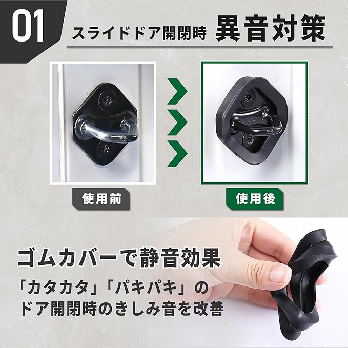 【スライドドアの異音・きしみ音を軽減】 ゴム製のカバーがスライドドアストライカーにしっかりフィットし、走行中や開閉時の「カタカタ音」や「ギシギシ音」の軽減が期待できます。取り付けは差し込むだけのシンプル設計で、特殊工具も不要。車内の静音性を高めたい方におすすめです