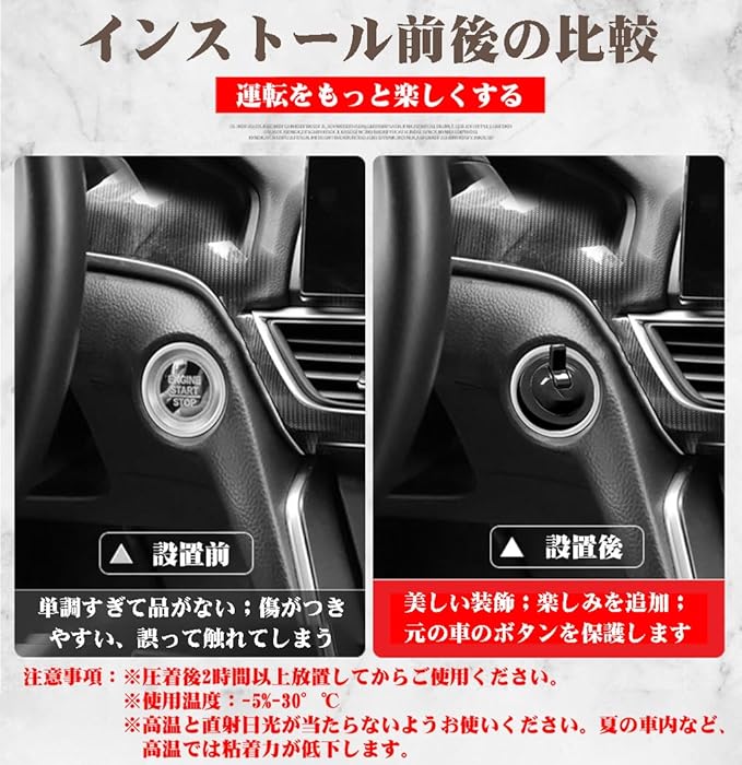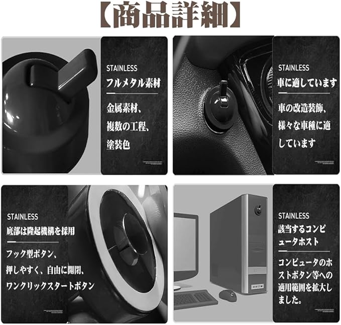 高品質素材・耐久&高級感 この新しいメタルワンプッシュスタートシフターオーナメントは、ほとんどすべての車のエンジンスタートボタンのレバーに適合します。耐摩耗性が高く、傷つきにくい合金素材を使用し、精密な塗装工法で作られています。丈夫で、損傷や老化しにくく、長期間にわたり美しい状態を保ち、車の内装に優雅な質感をもたらします。