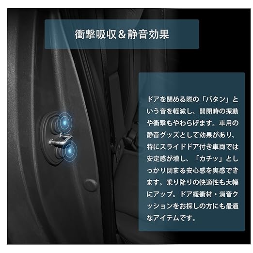衝撃吸収&静音効果:ドアを閉める際の「バタン」という音を軽減し、開閉時の振動や衝撃もやわらげます。車用の静音グッズとして効果があり、特にスライドドア付き車両では安定感が増し、「カチッ」としっかり閉まる安心感を実感できます。乗り降りの快適性も大幅にアップ。ドア緩衝材・消音クッションをお探しの方にも最適なアイテムです。