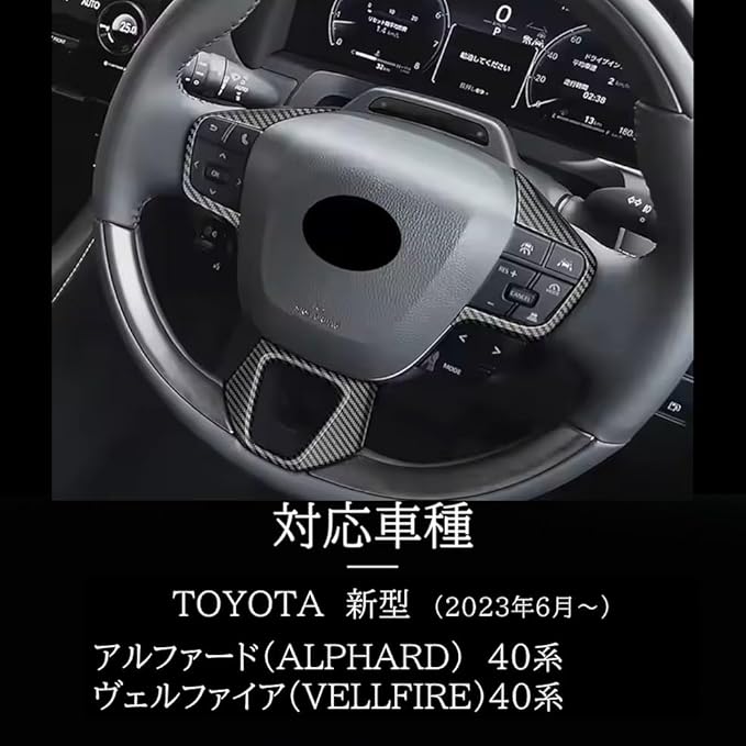 40系アルファード/ヴェルファイア専用設計!純正ステアリングに被せるだけで、車内空間をワンランク上の高級感へと導くABS製ハンドルカバーです。 洗練されたデザインと選べる3色のカラーバリエーションで、あなたの愛車をさらに個性的に演出。 高品質ABS樹脂を採用し、耐久性とフィッティング精度を追求しました。手軽に装着できるため、DIY初心者の方にもおすすめです。 商品説明詳細: ・高級感溢れるデザイン:** 純正ステアリングに自然に調和するスタイリッシュなデザイン。インテリアの雰囲気を高め、運転中の満足度を高めます。 ・高品質ABS樹脂:** 耐久性に優れた高品質ABS樹脂を採用。傷や汚れに強く、美しい状態を長く保ちます。 ・選べる3色 (1)ピアノブラック:** 上質な光沢が高級感を演出。 (2)カーボン調:** スポーティーで洗練された印象。 (3)シルバー:** シックで落ち着いた雰囲気。 ・簡単取り付け: 裏面に強力な両面テープを施工済み。ステアリングに被せるだけで、簡単に装着できます。専門工具は不要です。 ・専用設計: 40系アルファード/ヴェルファイアのステアリング形状に合わせた専用設計。高いフィッティング精度を実現しています。 --- 【適合】 ・トヨタ アルファード 40系 (2023年6月~) ・トヨタ ヴェルファイア 40系 (2023年6月~) 【仕様】 素材:ABS樹脂 カラー:ピアノブラック、カーボン調、シルバー セット内容:ハンドルカバー本体 1 取付方法:両面テープによる貼り付け (貼り付け前に脱脂を行ってください) 【取り扱い方】 1. 取り付け箇所の汚れや油分を、中性洗剤などで綺麗に拭き取ってください。 2. 仮合わせを行い、フィッティングを確認してください。 3. 両面テープの剥離紙を剥がし、しっかりと圧着してください。 4. 貼り付け後、24時間は走行を控え、テープの粘着力を安定させてください。 【注意事項】 ・グレードや年式により、ステアリング形状が異なる場合がございます。必ず現車のステアリング形状をご確認の上、ご購入ください。 ・両面テープの粘着力が弱い場合は、別途両面テープをご用意ください。 ・走行前に必ずしっかりと装着されているか確認してください。 ・輸入品のため、輸送時に細かな傷等が付く場合がございます。予めご了承ください。 【その他】 ・商品の画像は、お使いのモニターやブラウザによって色味が異なって見える場合がございます。 ・ご不明な点がございましたら、お気軽にお問い合わせください。
