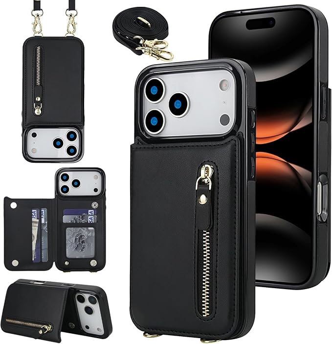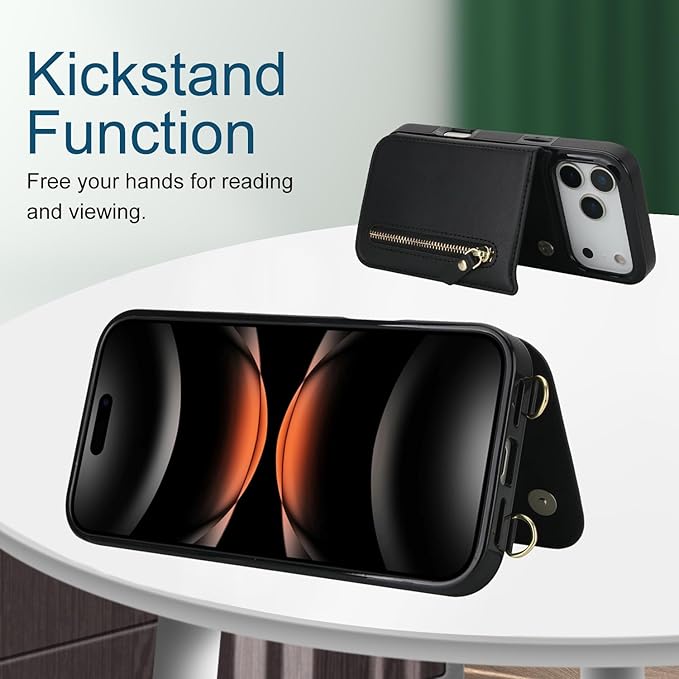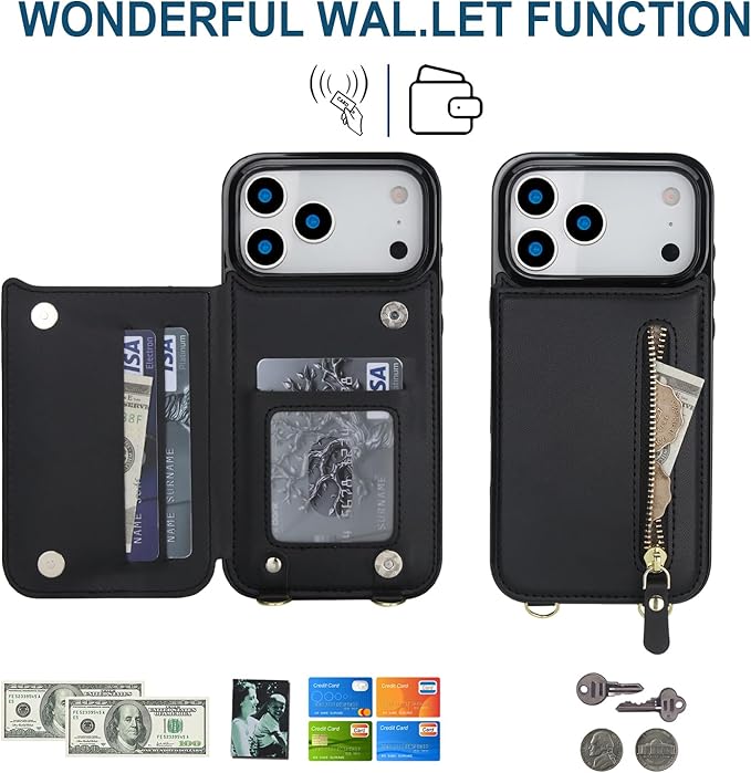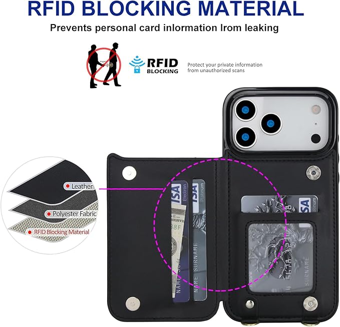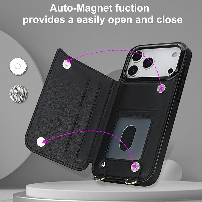 Cavor 適用iPhone17 Pro Max ケース手帳型肩掛け首か 斜めがけ適用iPhone17 Pro Max ケース財布型適用iPhone17 Pro Max ショルダーケース【RFID機能】磁気閉鎖適用iPhone17 Pro Max ケースカード収納【マグネットダブルデザイン】クロスボディ付きの専属ストラップ同梱なので 横置 ICカードホルダー-ブラック