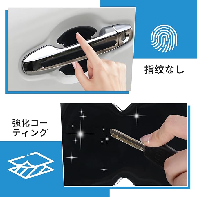 【強化コーティングで高級感と耐久性を両立】高級感のあるマットブラックベースにシルバーロゴをあしらい、指紋や汚れが目立ちにくい仕様。表面の強化コーティングにより、日常の細かなキズや摩擦からドアハンドルを保護します。