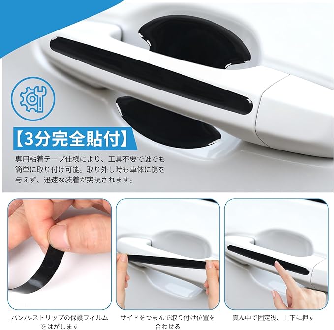【強力粘着テープで工具不要の簡単取り付け】付属の強力両面テープを使用し、位置を決めて貼るだけで設置完了。※15℃以下ではドライヤーで軽く温めると、より確実に貼り付けられます。
