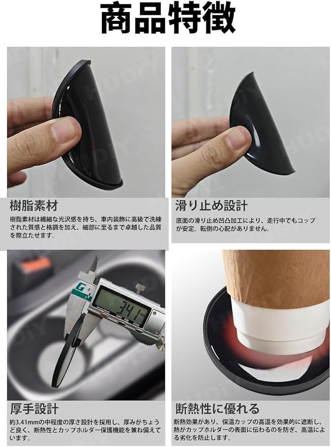 【耐久防滑】表面は光沢と硬度を兼ね備えたレジン(樹脂)コーティングで仕上げているため、キズに強く、長く美しい見た目を維持します。銀色ロゴはコーティングの内側に保護されているため、摩擦による剥がれや摩耗の心配がありません。裏面は高い摩擦係数を持つシリコン素材を採用,カップホルダー内でずれにくく,カップ自体の滑り止めとしても機能します。