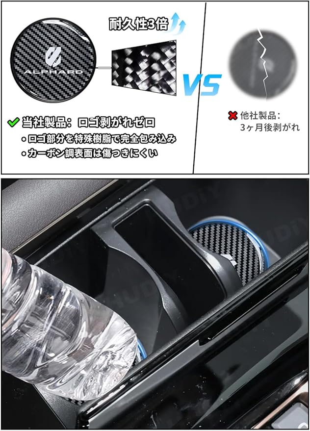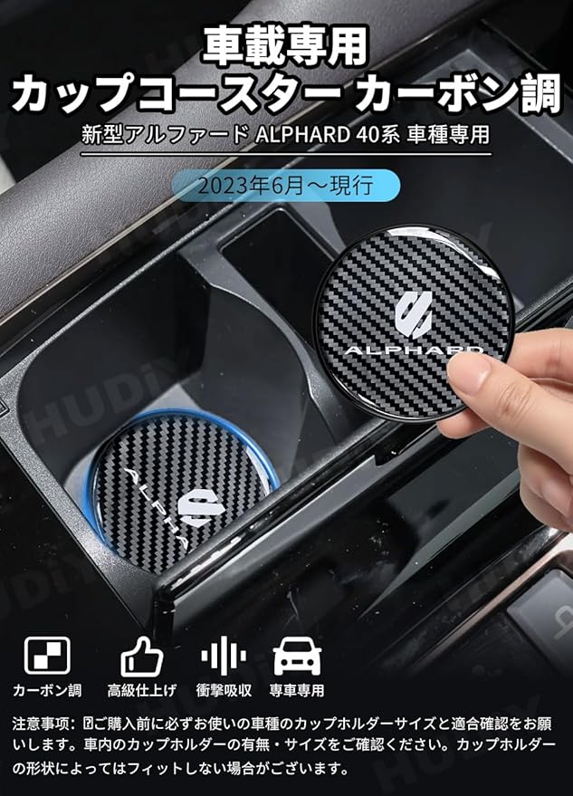 HUDIY(フーディ)アルファード 40系専用 カップコースター車 カーボン調 車載ドリングホルダーコースター 車用ノンスリップ 専用ロゴ 超耐久 ロゴ剥がれ防止 滑り止め 防水 防塵 ロゴ印刷 UV樹脂コーティング 三層構造 車内インテリア プレゼントに 2個セット