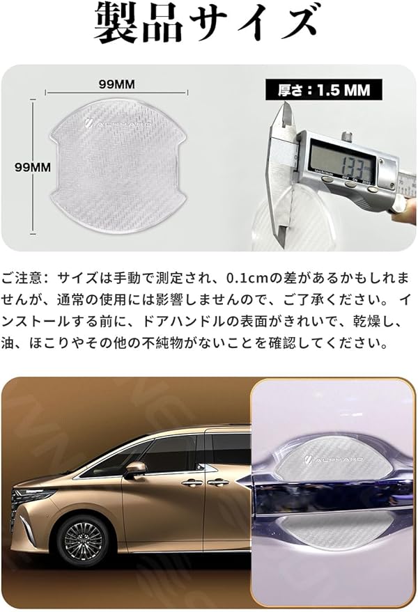 [対応車種] 適合ALPHARD 40系 AAHH40W AAHH45W(2023年6月~現行)。ご注意ください:取り付ける前に、ドア・ハンドルの表面がきれいで、乾いており、油脂やほこりなどの汚れがないことを確認してください。気温が15℃以下の場合は、温めてしっかりと装着してください。