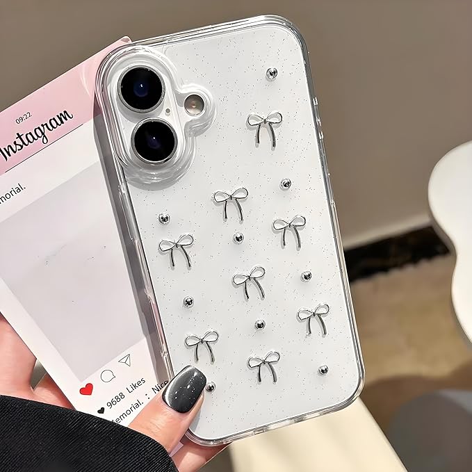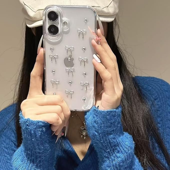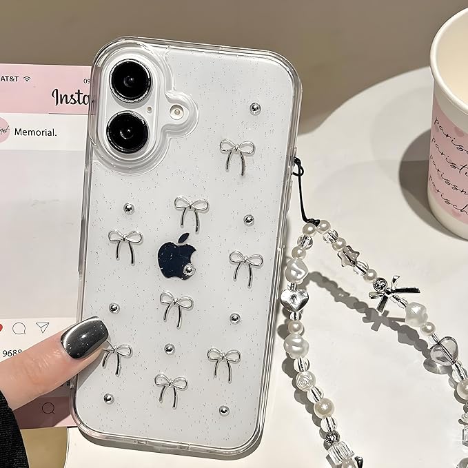 【透明感が高くで可愛らしいリボンケース】シルバーの小さなリボンとパール、控えめなラメが散りばめられた、大人可愛いiPhone用クリアケースです。シンプルながらもゴージャスな雰囲気を演出します。透明なデザインでiPhone本体のカラーやデザインを損なわず、さりげなくおしゃれを楽しめます。 【立体的なリボンとパールパーツ】 リボンやシルバーのボールは立体的で、触っても手に馴染むデザイン。しっかりとコーティングされており、衣類などに引っ掛ける心配も少なく安心です。