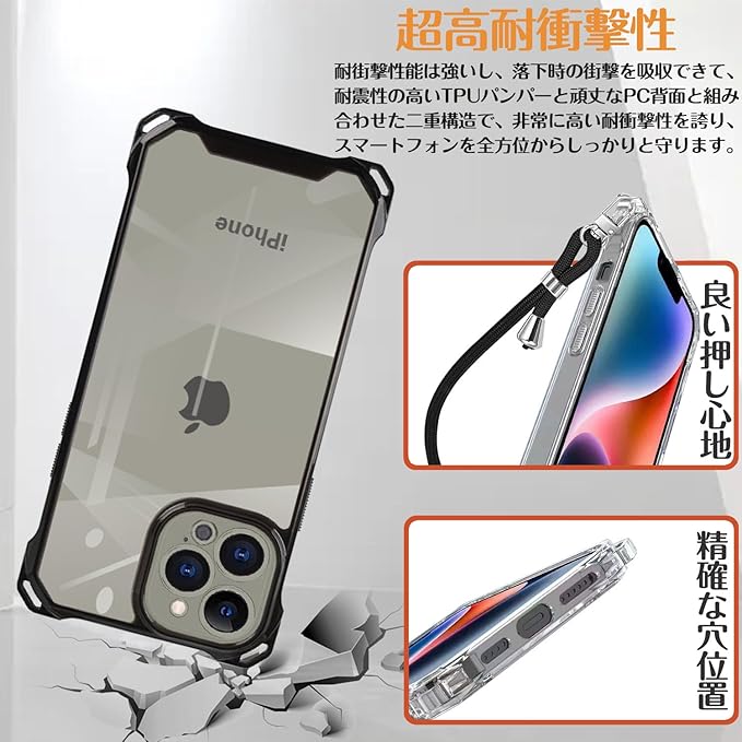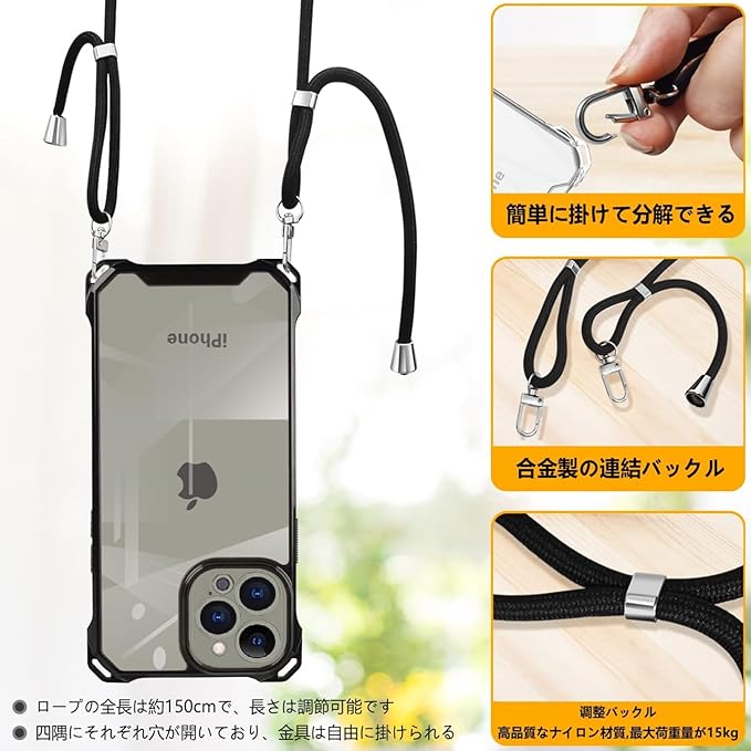 iPhone 16 Pro Max ケース クリア PC ショルダー 軽量 耐衝撃 カバー アイフォン16 Pro Max ケース 透明 薄型 軽量 PC背面 + TPUバンパー 二層構造 携帯ケース 首掛け 肩掛け 斜めかけ 縄掛けケース ストラップ付き 1.5M 取り外し可能 縦/横 2WAY 調節可能な 全面保護 落下防止 衝撃吸収 (ブラック)