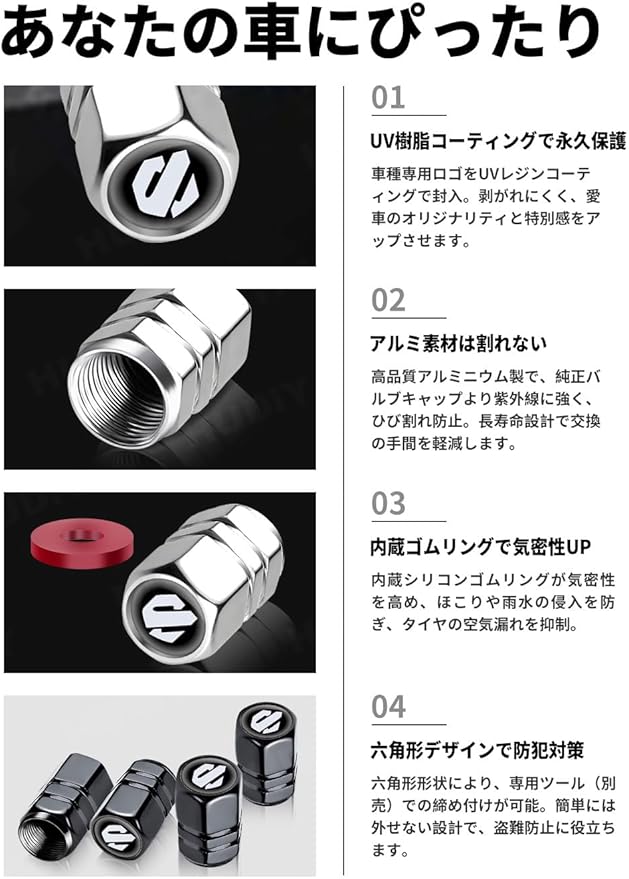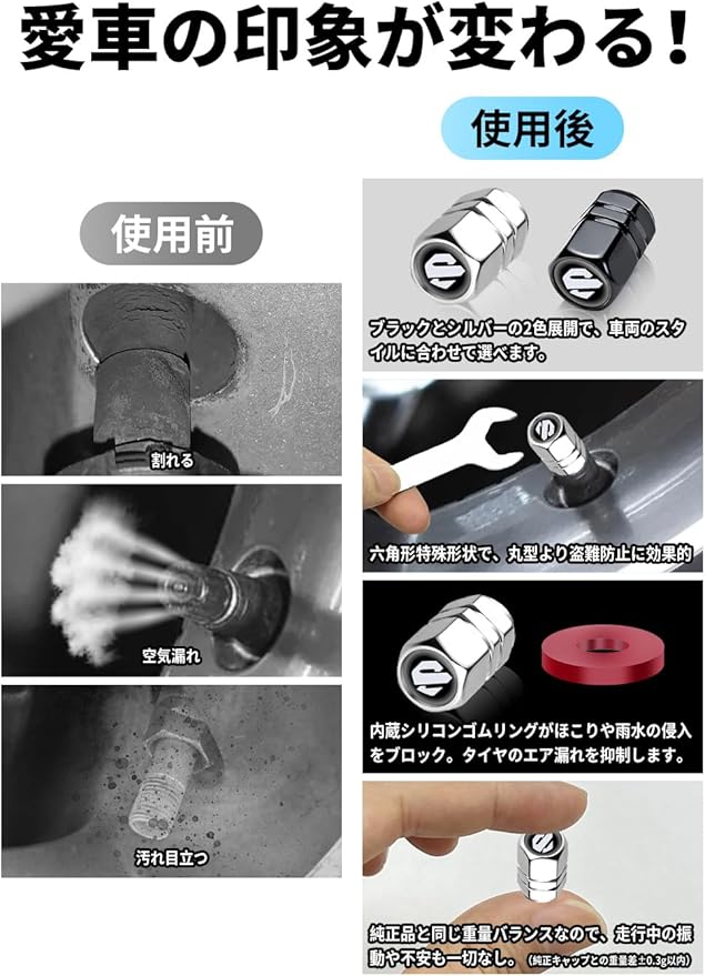 [車の体験を向上させる] 多彩なメリットでカーライフを向上。純正バルブキャップの「割れやすい」「汚れが目立つ」といった課題を解決。タイヤのバランスにも影響せず、気密性向上&防犯設計で、あらゆる面からドライビング体験をアップグレード。バルブキャップの理想的な進化形です。