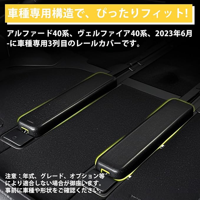 【対応車種】アルファード40系、ヴェルファイア40系、2023年6月-に車種専用3列目のレールカバーです。注意:年式、グレード、オプション等により適合しない場合が御座います。事前に車種や形状をご確認ください。