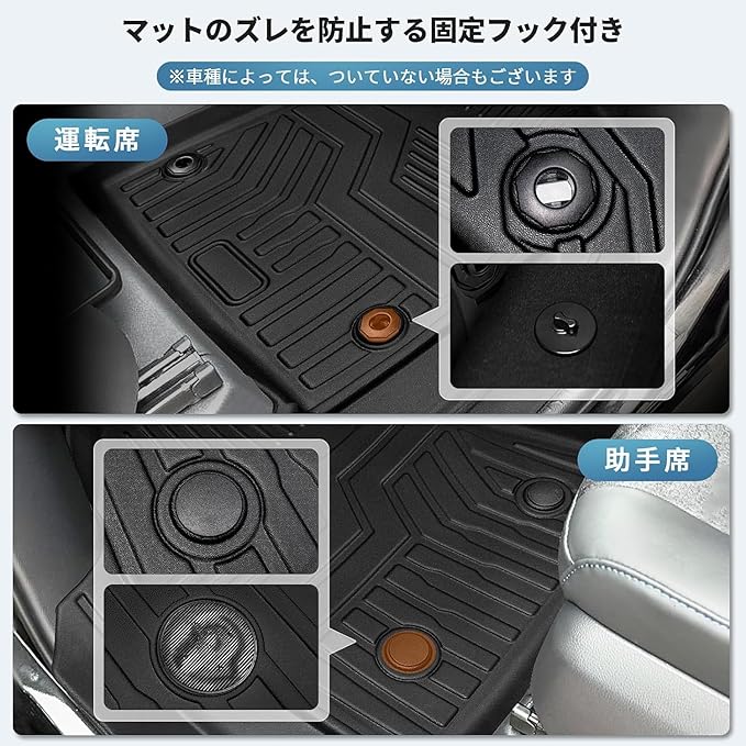 【高級感溢れる上質なTPE素材】アルファード ヴェルファイア 30系のフロアマットは、優れた防水性能と耐摩耗性を持つ高品質のTPE素材を採用し、傷や汚れを防ぎます。また、マット表面は凹凸仕様で、足元の滑りを防ぎ、裏面にはズレを防止する固定フック付き、前後にズレることなく、運転中の安全性を高めます。なお、重厚感溢れる「黒」のフロアマットが車内に洗練された印象と高級感を与えます。