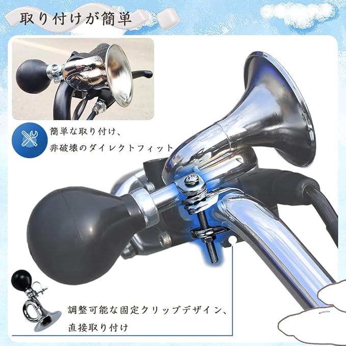 取り付けが簡単、このホーンは、どんなタイプの自転車のハンドルバーにも、シンプルなネジ止め機構で簡単に取り付けられます。調整可能な固定クリップデザイン、直接取り付け。