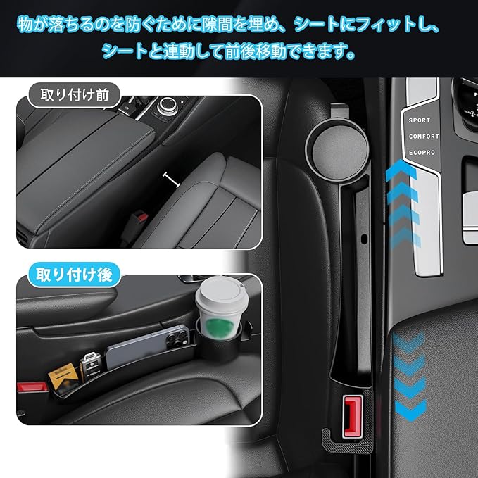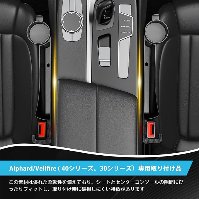 隙間クッション カーシート隙間収納ボックス アルファード・ヴェルファイア 30・40 系専用 車 隙間収納 運転席 助手席 コイン カード メガネの収納ポケット 小物落下防止 カー用品 充電しながら使える ドリンクホルダー 便利グッズ アクセサリー ブラック (運転席・助手席計 2 個)
