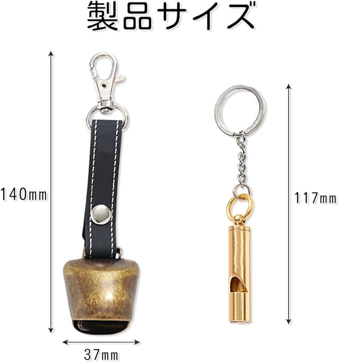 1.【製品仕様】 セット内容:熊鈴 1個、ホイッスル 1個 材質:熊鈴 - 真鍮鋳物、ホイッスルストラップ - 人工皮革(PUレザー) 重量:約57g(セット全体)