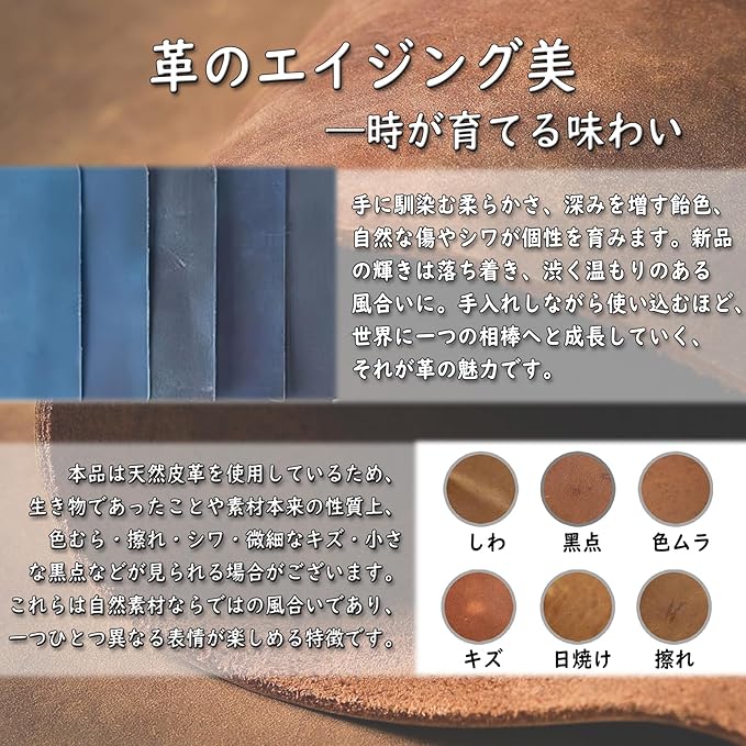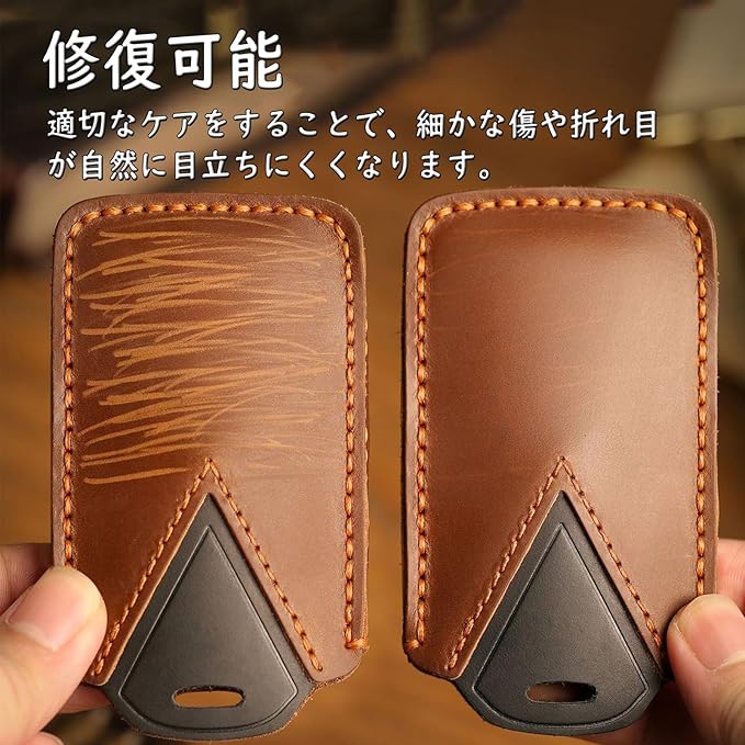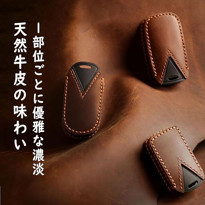 キーケースは自然な革の風合いと独特の毛穴・木目調のシワを持ち、使用するほどに色艶の変化が味わい深くなります。職人が「二本針縫い」で縫製しており、スマートキーの重さに耐える強度と手作りの温かみを両立。縁部分のオイル処理によりほつれを防止しています。通気性に優れた革構造でリモコン信号を遮断せず、安定した通信を可能にしました。日常的な摩擦に強く、軽く拭くだけで細かな傷が目立たなくなる特性があり、定期的なオイルメンテナンスで経年劣化を防ぎながら自然な経年変化を楽しめます。「自然な経年変化を楽しみたい」「機能性と耐久性を兼ね備えたアイテムが好き」という方に最適です。