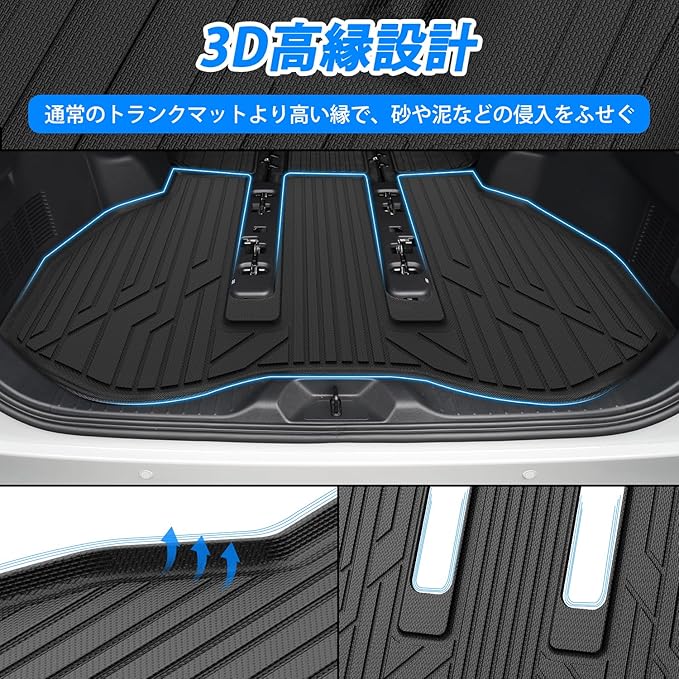 3.【3D立体構造&防水仕様】3D立体構造で通常のトランクマットより高い縁で、砂や泥などの侵入をふせぎます。防水TPE素材を採用し、汚れが染み込みにくく、濡れた水着や雨水などでの汚れを防ぎます。日常のお手入れも簡単で、サッと拭くだけで清潔!ホースで直接洗えることもでき、いつでも新品のような清潔さをキープします。