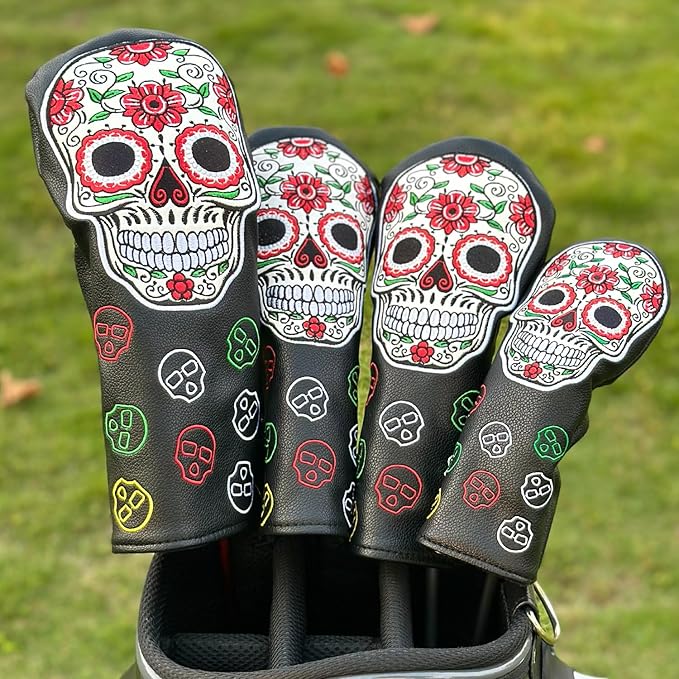 ゴルフヘッドカバー ゴルフクラブ レッドフラワー スカルデザイン ゴルフカバー PUヘッドカバーセット ドライバーフェアウェイウッドハイブリッドユーティリティウッズアイアンウェッジヘッドカバーにフィット。