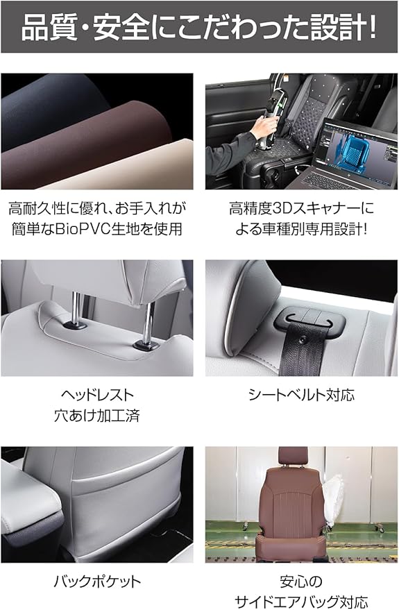 【完全車種別専用設計】3Dスキャナーを用いた車種別専用設計で、張替えのように純正シートにぴったりフィット。【耐汚れ】PVC素材を使用しているため、汚れてもお手入れが簡単。【デザイン】シンプルながらも曲線を取り入れたデザインは幅広い車種に違和感なくマッチするシートカバー