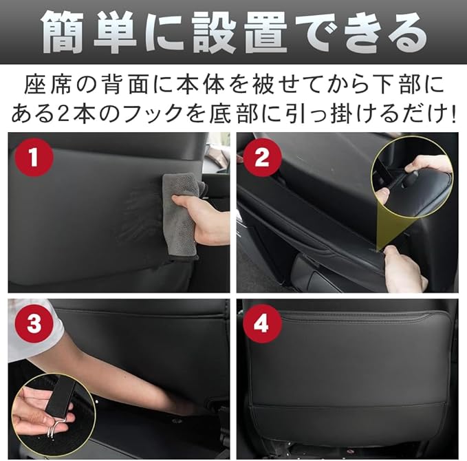 座席の背面に本体を被せてから、下部にある2本のフックを座席の底部に引っ掛けるだけで簡単に設置完了です。貼り付け式とは異なりフックでガッチリ固定するため、走行中や急ブレーキによる振動で落下する心配がありません。