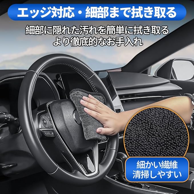 【細部まで拭き取る 乾きやすい】この車用マイクロファイバークロスは、細かく編まれた繊維を使用しており、ハンドルなどの細部に隠れたホコリや汚れを簡単に拭き取ることができ、より徹底的なお手入れが可能です。使用後は水で洗い流し、水分を絞った後にフロントガラスに置いて干すことができます。何度でも使用できるため、頻繁に交換する必要がありません。