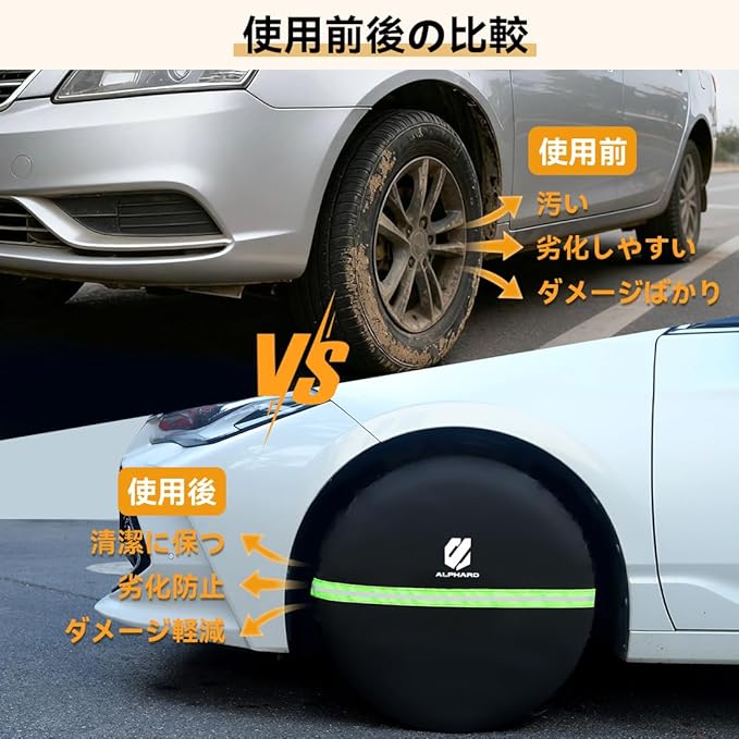 【安心駐車・車の識別性向上】この車用タイヤ保護カバーには反射ストリップが装備されており、屋外や駐車場に車を停める際に愛車の識別性を向上させます。夜間や暗い場所でも他の車両や歩行者の目を引き、事故を防ぐことができます。また、野良動物によるタイヤの汚染を防ぐ効果もあります。