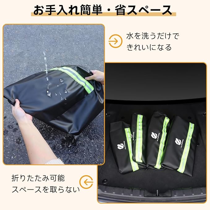 【高耐久性 収納が便利】このタイヤプロテクターは、高品質なポリエステル繊維を使用しており、耐摩耗性があるため、タイヤを長時間良好な状態に保つことができます。高温や低温にも耐えられるため、厳しい条件にも対応可能です。日常的にたまるほこりなどを水で洗うだけで、きれいに保つことができます。使用しないときは折りたたんで、車内のスペースを節約し、収納も簡単です。