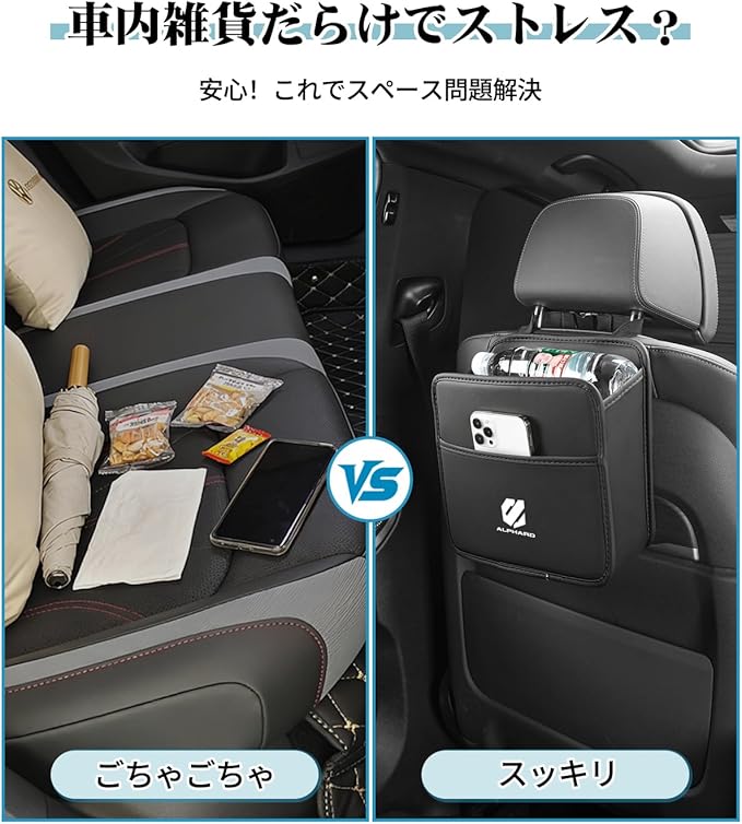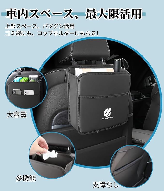 【質感の高級さ・ロゴ付き】この車シートバックポケットは高品質PUレザー素材を採用しております。この素材は視覚上の高級感を演出するだけでなく、防水・防汚性に加え、耐スクラッチ性にも優れております。そのため、汚れは拭くだけで簡単に除去できます。また、製品には専用ロゴがプリントされておりますので、お客様の愛車の高級感とデザイン性を高めることができます。【適用車種】アルファード 20系 30系 40系
