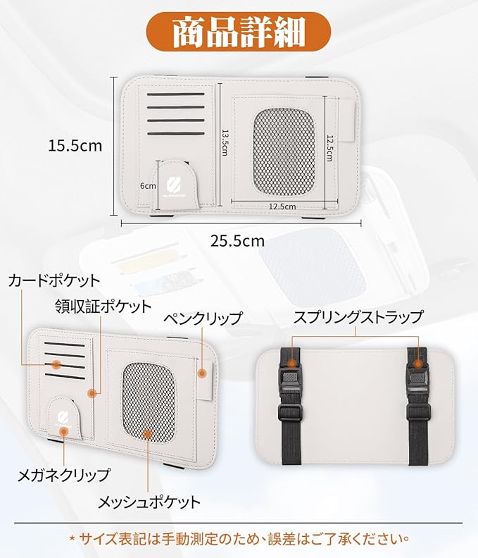 【多機能&スキッと収納】商品サイズ:25.5 15.5 0.3cm。 サンバイザーポケットは通常カードポケットに加えだけなく、メッシュポケットやメガネクリップなどもセットで、収納力アップ。複数カードポケットは散らかるカード類をスキッと収納、見えるメッシュポケットで、駐車券やガソリン会員券重要な券一目に確認、また、メガネクリップはマジックテープ採用して、使用やすいです。