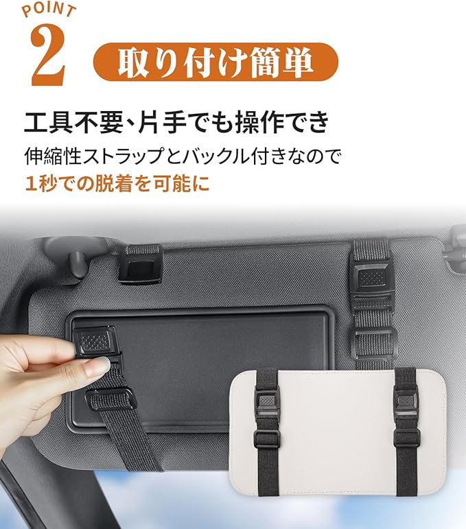 【後方視界確保&落下にくい】サンバイザーポケットはサンバイザーサイズに合わせて設計されます。ドライバ一の安全を最優先に考えて、超薄型デザインで車体に密着し、運転中の視界を一切妨げない確保します。また、強力で安定したマジックテープなので、メガネをしっかりと固定し、物が落下を心配する必要はありません。