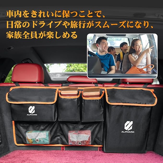 【専用ロゴ付き】このアルファード Alphard ヴェゼル専用トランク収納ポケットには専用ロゴが施されており、車内の雰囲気と見事に調和し、愛車の整理整頓に最適なサポート役です。ヘッドレストに掛けて使用することで、車内のトランクスペースを効果的に活用できます。