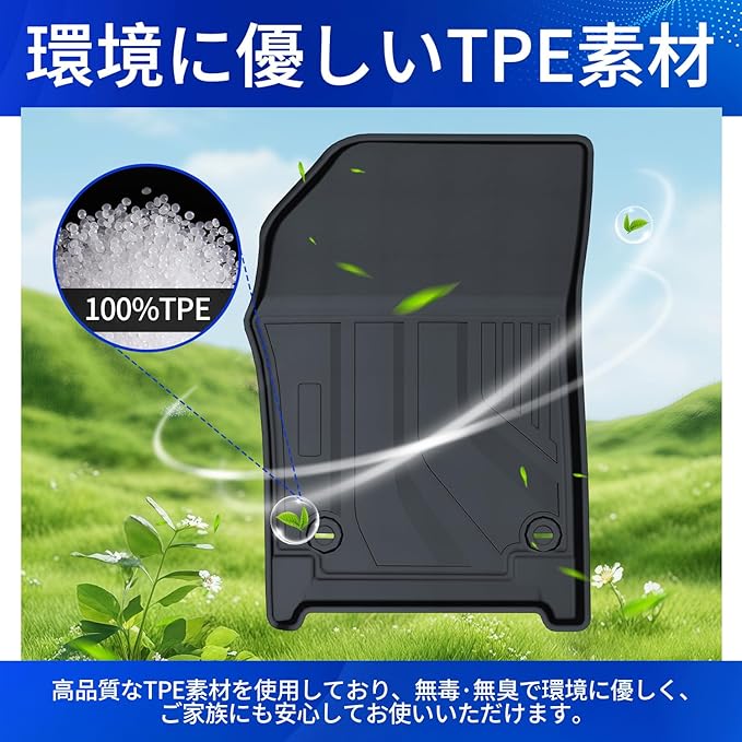 【高品質TPE素材を使用】当フロアマットの基材には、高品質TPE素材を採用しています。この素材は環境に配慮され、異臭が一切なく、肌触りが柔らかで快適な足元を実現します。さらに優れた耐久性を誇り、長期間使用しても変形しにくい特性を持ちます。これにより、ドライバーに快適な運転体験を提供すると同時に、3D立体構造と相まって液体の侵入防止に貢献します。