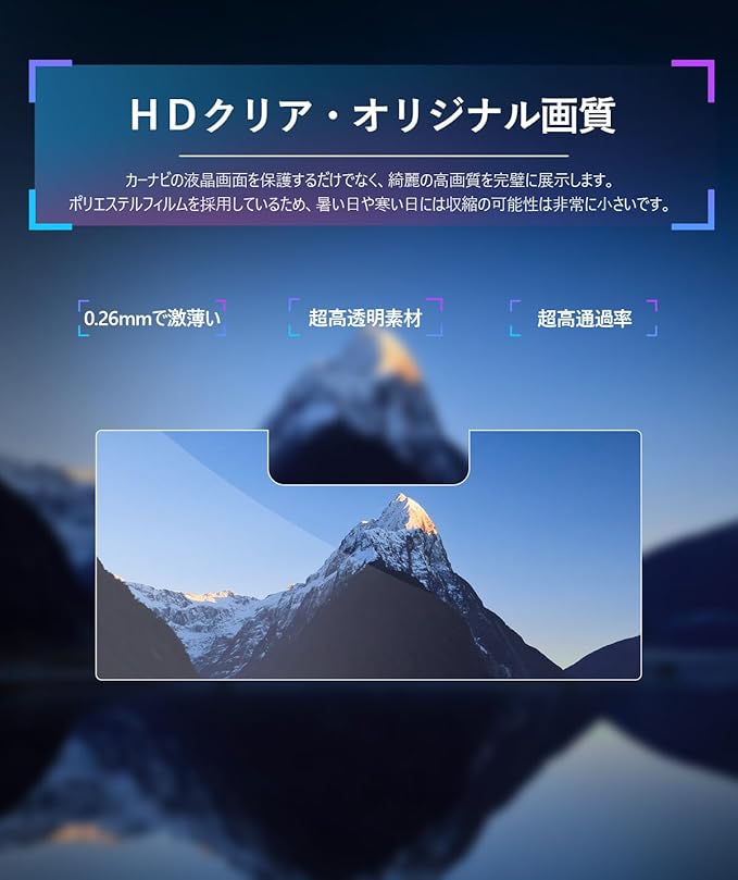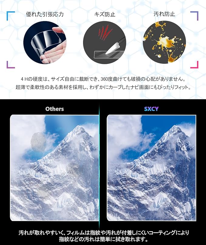【指紋や汚れ防止・超高透明度】日常生活の中で、ナビ画面に指紋や油汚れがついてしまい、視認性が低下する困ることがありますが、ナビ フィルムはAFコーティング処理を施しており、優れた防汚・防指紋効果を提供し、万が一指紋が付いても、湿らせた布で軽く拭くだけで簡単にキレイにできます。その上、99.9%の高透過率を持ち、ナビ画面の鮮明さを損なうことなく、視認性の高い映像をお楽しみいただけます。