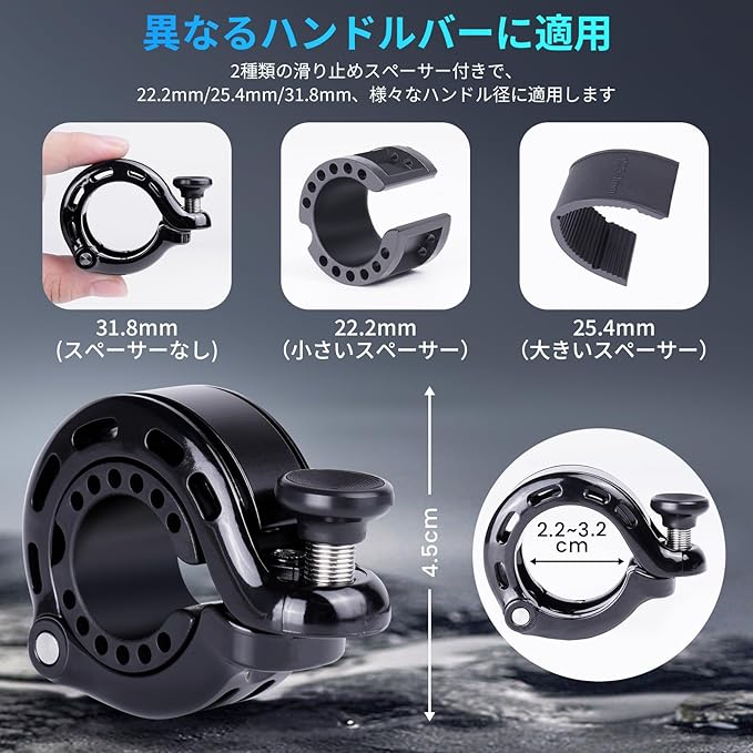 【22.2-31.8mm広範囲対応・様々な車種に適合】2種類の滑り止めスペーサー付属で、22.2/25.4/31.8mmのハンドル径に対応。ロードバイク、マウンテンバイク、クロスバイク、折り畳み自転車、シティサイクルなど、あらゆる自転車・キックスケーターに取り付け可能です。