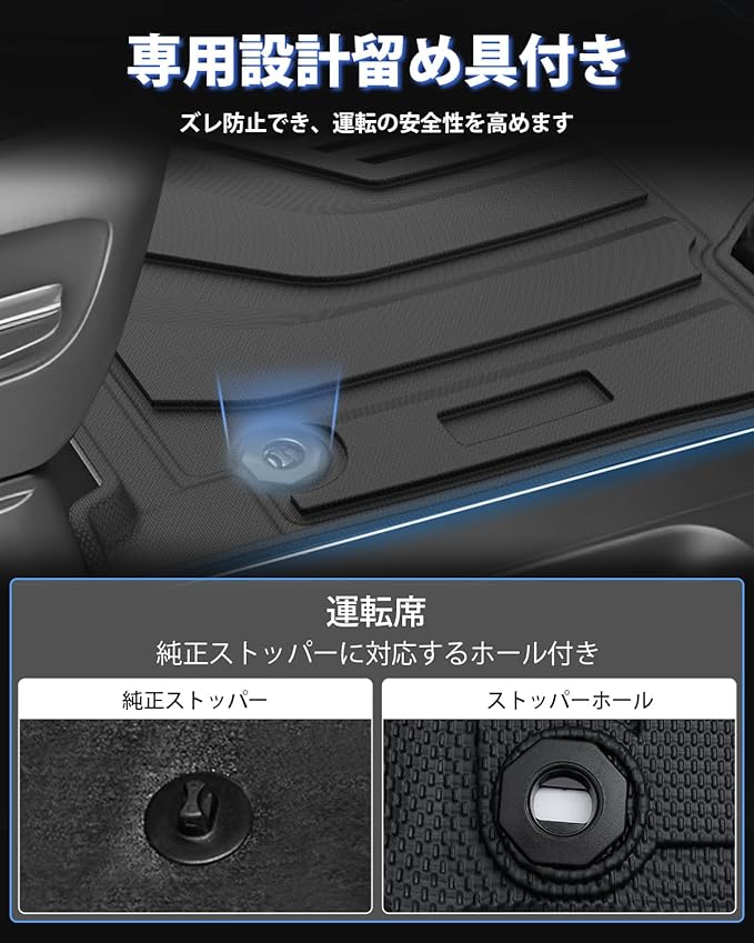 4.【車種専用設計】:車種専用のこだわりデザインなので、アクセル・ブレーキペダルに干渉せず、隙間なくぴったりとフィットします。専用設計留め具付き、運転の安全性を高めます。取付は純正マットを取り外してそのまま敷くだけです。ご注意:配送サイズ規定の関係で商品を折り状態で発送いたします。到着後にお湯やドライヤーなどで暖めれば元の状態に戻ります。ご理解いただいた上で、ご購入をお願い致します。