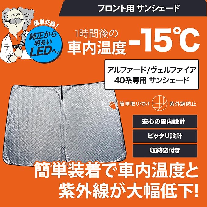 アルファード ヴェルファイア 30系・40系専用の フロント用サンシェードが登場! 表はシルバー、裏はブラック ハンドルやシートが熱くなりすぎないようにサンシェードがおすすめ!