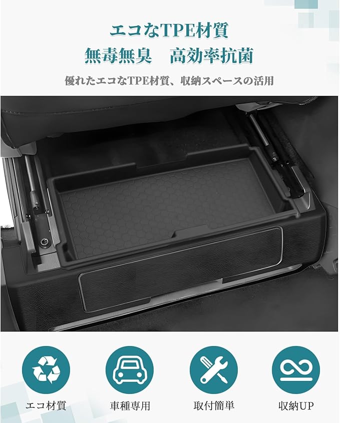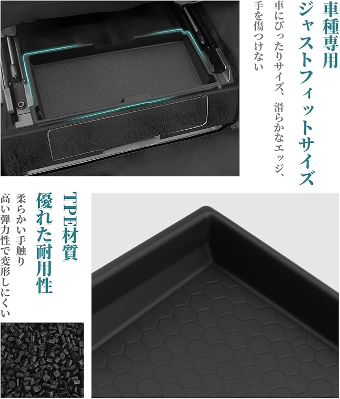 製品はHUAHAO製、車用カスタムのシートアンダートレイです。ご購入前、必ず車種をご確認ください。 車種専用:トヨタ アルファード/ヴェルファイア 40系 (2023.6~現行) TPE材質・抗菌特化:収納ボックスは高効率抗菌専用TPE材質が作成され、強力抗菌性能、防臭性能、長期持続除菌性、人体無毒性に効果があり、細菌や病菌などが原因となる様々な匂いの発生に役たちます。防カビにもご活用いただけます。 優れたエコな材質:優れたエコなTPE材質を採用することによって、抗菌性、耐衝撃性、耐熱耐寒、安定性、滑り止めなど機械的特性に優れたポテンシャルを発揮します。 収納スペースなり:ぴったりサイズで助手席シート下に使えて、普段使うものを上に置いて、収納スペースになり、利用するときにも便利です 収納性・便利:スマホ、カード、コイン、メガネや鍵など、小物関係の収納には最高です。ノーマルの無駄な広い空間をトレーを使う事によって機能性と収納性が飛躍的に上がりへの転換しましょう!! 滑り止めデザイン:滑り止めの材質で、運転中に小物が滑たり、がたがたしたりすることも心配しません。 簡単取り付け:差し込むだけの簡単な取り付けられ、ジャストフィット!! ※商品に問題があった場合はお手数おかけ致しますが、まずは当店と連絡してください。 当店はお客様の質問や要求に24時間以内にお応えするよう待機しています。※