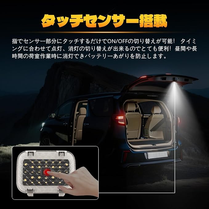 【タッチセンサー機能搭載】レンズ中央のスイッチマークをタッチするだけで、簡単にON/OFFの切り替えが可能。ご注意:タッチしても点灯しない場合もありますが、その際は一度ルームボタンランプをオフしてから再びオンしてみてください。