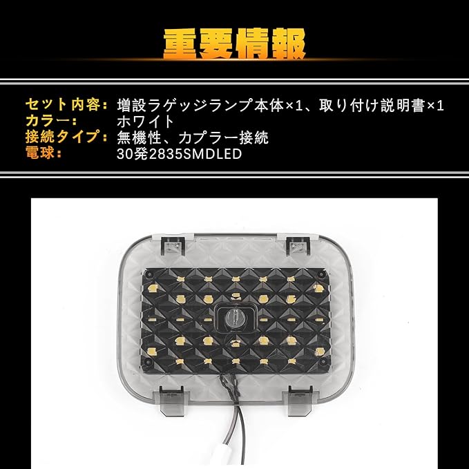 【適合車種】トヨタ アルファード ヴェルファイア 40系。年式:2023年6月~現行;型式:AGH40W AGH45W型。セット内容:アルファード40系 増設ラゲッジランプ 1。※年式/グレード/オプション等により適合しない場合が御座います、ご確認の上お買い求めください。