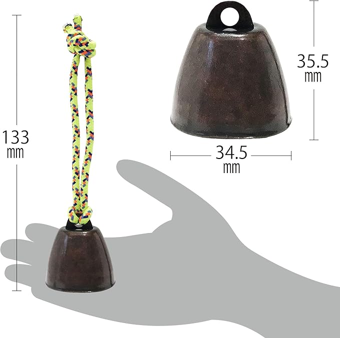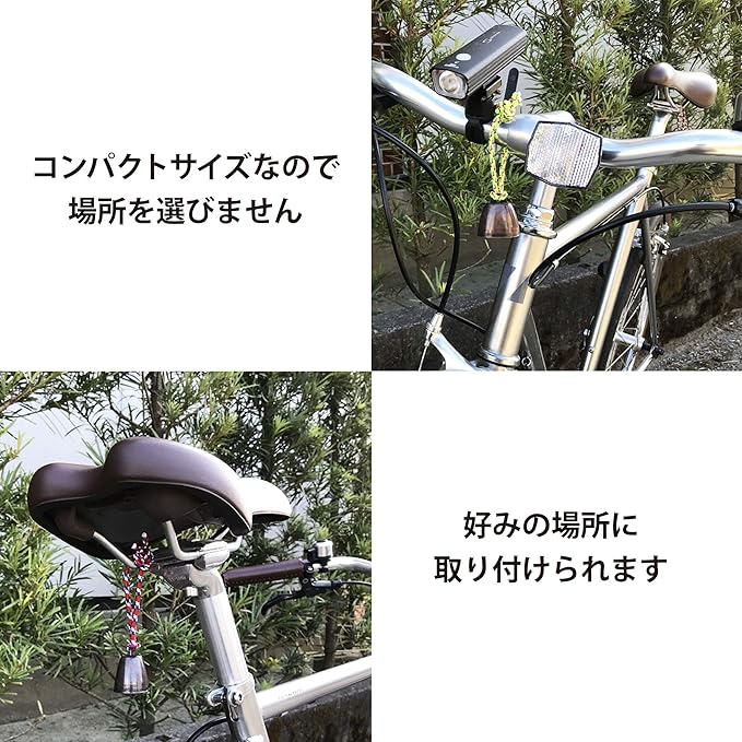 【軽量、コンパクトで場所を取らない】ベルを取り付けている紐は長めにセットしているので取り付けたい所にくくり付けられます。またベルの取り付けもリングを使わず直接結っているので外れる心配がありません。またコンパクトサイズで邪魔にならないのでお好みの場所に取り付けられます。