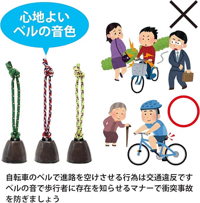 【自転車の存在を知らせるベルの音】サイクリングを楽しむのに歩道を走行する事も多い自転車ですが、歩道をふさぐ歩行者にむやみやたらに自転車のベルで進路を空けさせる行為は交通違反にあたります。そんな時、あらかじめこのベルを自転車に取り付け音を鳴らしながら走行すれば歩行者にこちらの存在を気付いてもらえます。思いやりをもって歩道を走行すれば衝突事故も防ぐこともでき、風鈴のように心地よい音を響かせるベルの音は周りへのマナーとなるでしょう。
