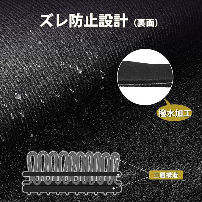 2.「柔らかくて快適感(製品表面)」:表面が摩耗強度の高い生地(厚さ7~9mm)を採用し、太さ・高さ・密度を徹底的にこだわりました。ふかふかな踏み心地を実感し、長期間使用しても完璧な復元力。クッション性あり、足の疲労軽減につながります。また、通常バージョンでウェーブ柄デザインが追加され、車内の雰囲気をガラッと変えて、快適感もアップしています。