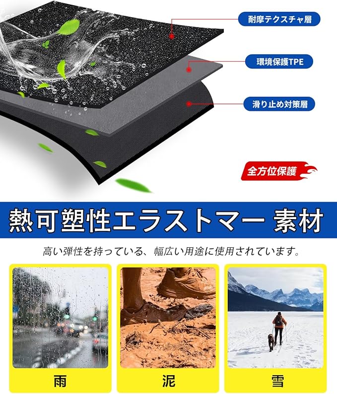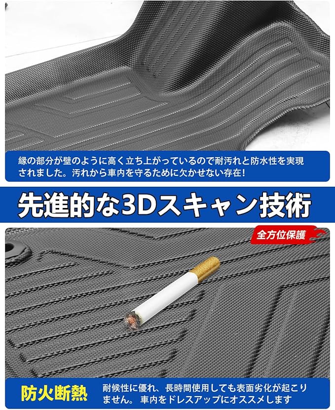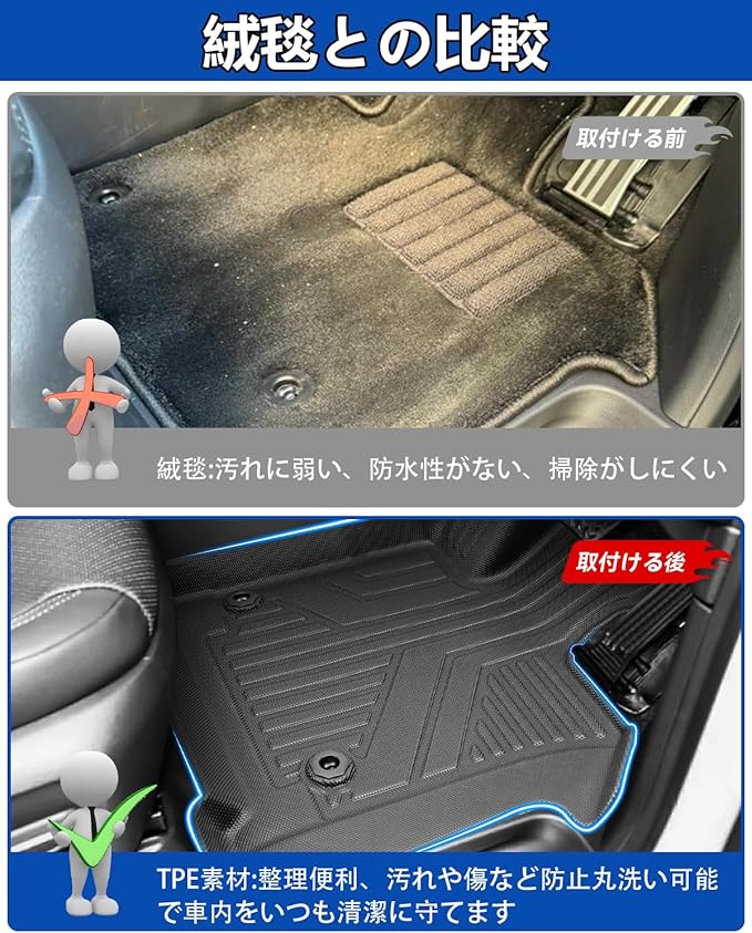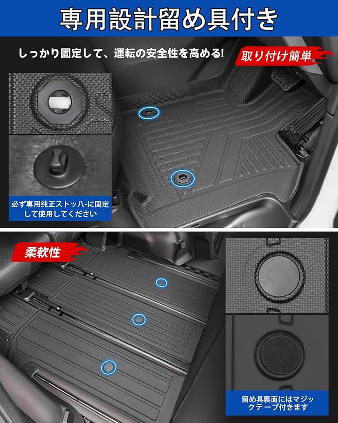 2.【車種専用設計】:こだわり車種専用設計のため、車内に隙間なくフィットします。ズレのない抜群なフィッティング!運転席は純正ストッパーに対応するホール付きます。それに、助手席は留め具裏面にはマジックテープ付きます。アクセルペダルとブレーキペダルに干渉しません。■座席のスライドレールに干渉しません。TPE樹脂素材を採用していますので、耐候性に優れ、長年使用しても割れ、変形、変色を起こさないマットに最適な素材です。車内をドレスアップにオススメ!