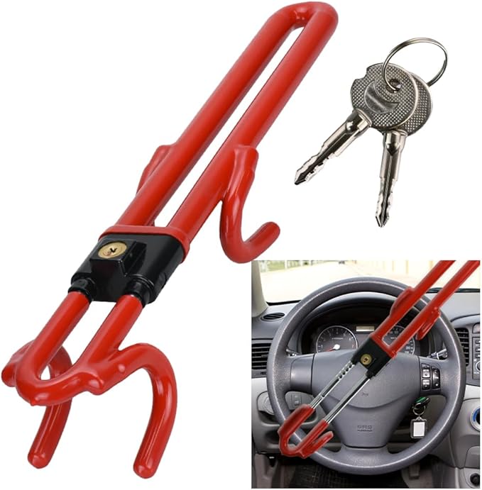 【Smilea公式】車用ハンドルロック 取り付け簡単 車両盗難防止 リレーアタック対策 スペアキー付き 堅牢シリンダー 二重施錠 愛車保護 視認性 (レッド)